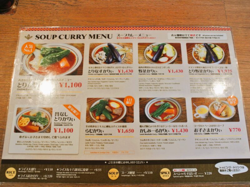 総本家の基本メニューは「とりかりぃ」「野菜かりぃ」「らむかりぃ(ラム肉)」「かしみーるかりぃ(ミートボール)」「お子様かりぃ」など全8種類とシンプル。なお「骨なしとりかりぃ」は数量限定、「らむかりぃ」は土日限定メニューとなっている。