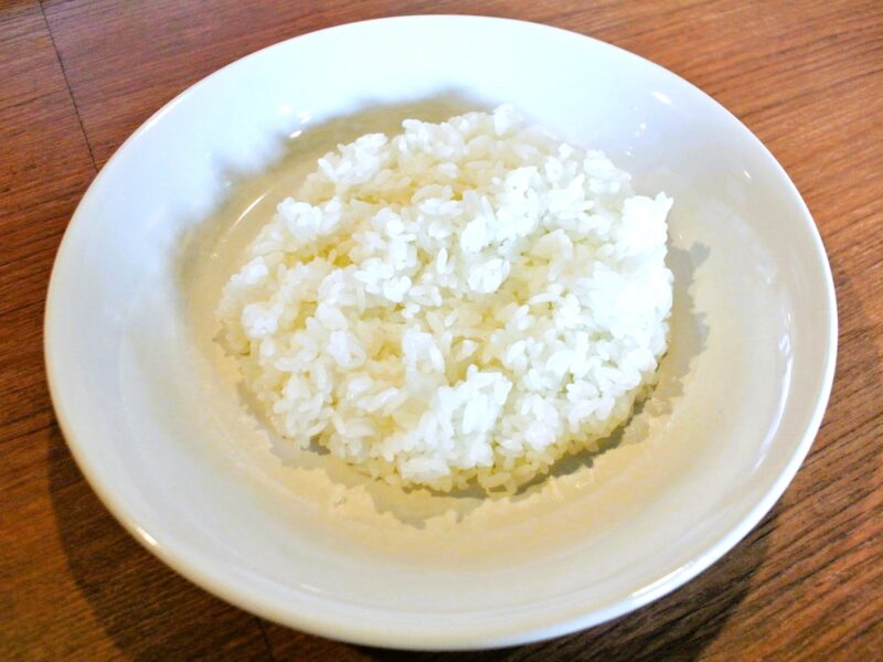 筆者は白米を普通盛り(無料)でオーダーした。普通盛りが何グラムかはメニューに明記されていなかったが、だいたい250gくらい。中年男性には腹八分の適量かも…。