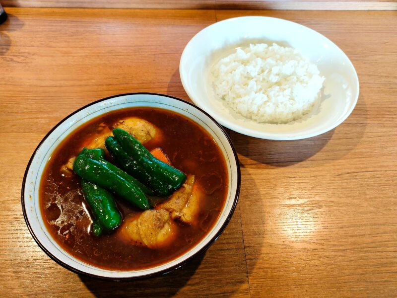 さてようやくご対面できた「とりかりぃ」は、小ぶりのチキンレッグが2本、大きくカットされたニンジンが1本、そして3分割されたピーマン1個という、シンプルながらも豪快なトッピングが特徴であり、スープは渾身の1種類、辛さ指定不可という尖具合もさすが元祖。