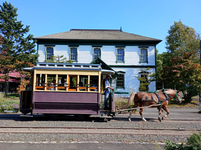 市街地群では馬車鉄道が運行されている。運行期間は4月中旬から11月まで、運賃は3歳以上250円となっている。現在、札幌市民の日常生活の足となっている路面電車のルーツは、明治42年の札幌石材馬車鉄道合資会社が運行していた馬車鉄道だった。いやぁとても良い雰囲気…。